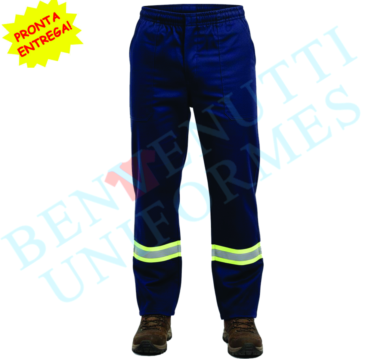 Calça brim 100% elástico com faixa refletiva verde. 04 bolsos ( 02 frontais e 02 traseiros)