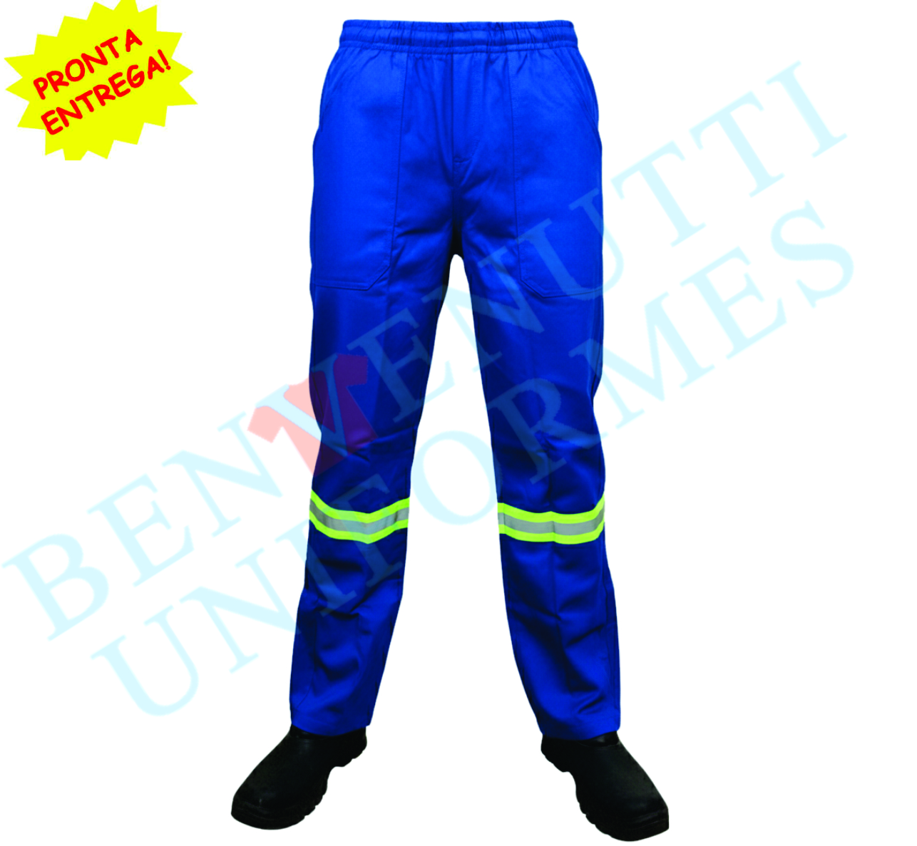 Calça brim 100% elástico com faixa refletiva verde. 04 bolsos ( 02 frontais e 02 traseiro)