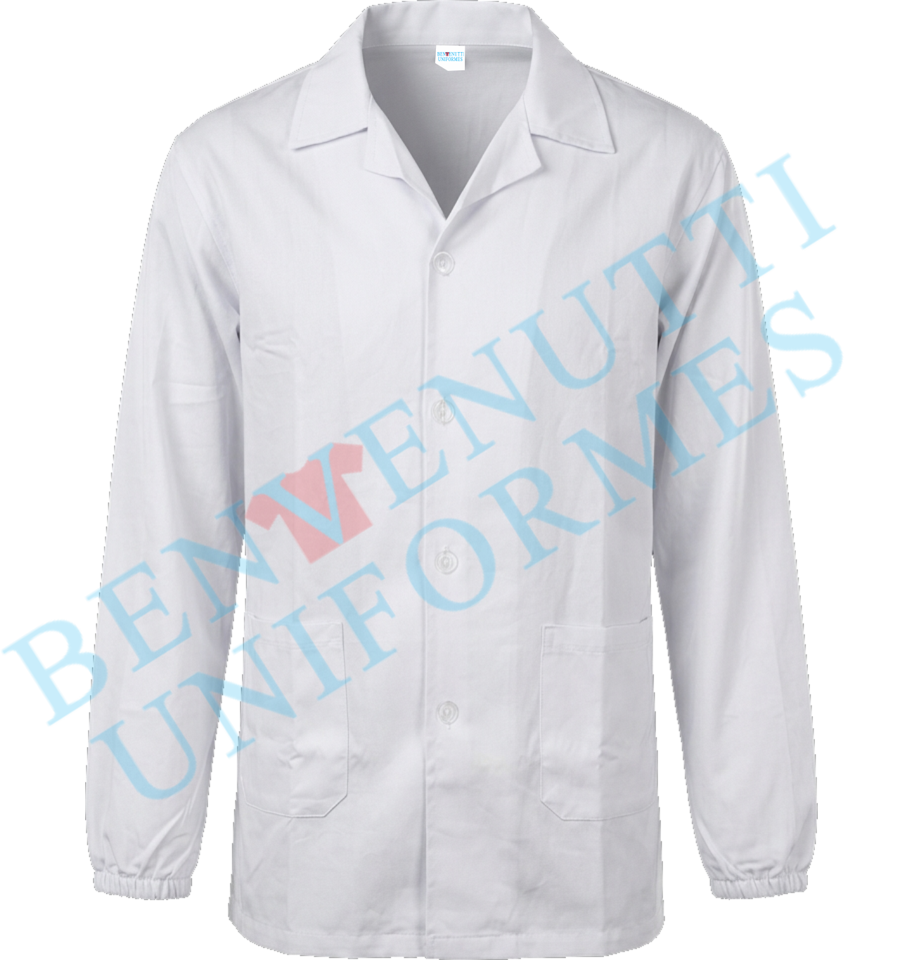 Jaleco médio com dois bolsos frontais e elástico nos punhos.